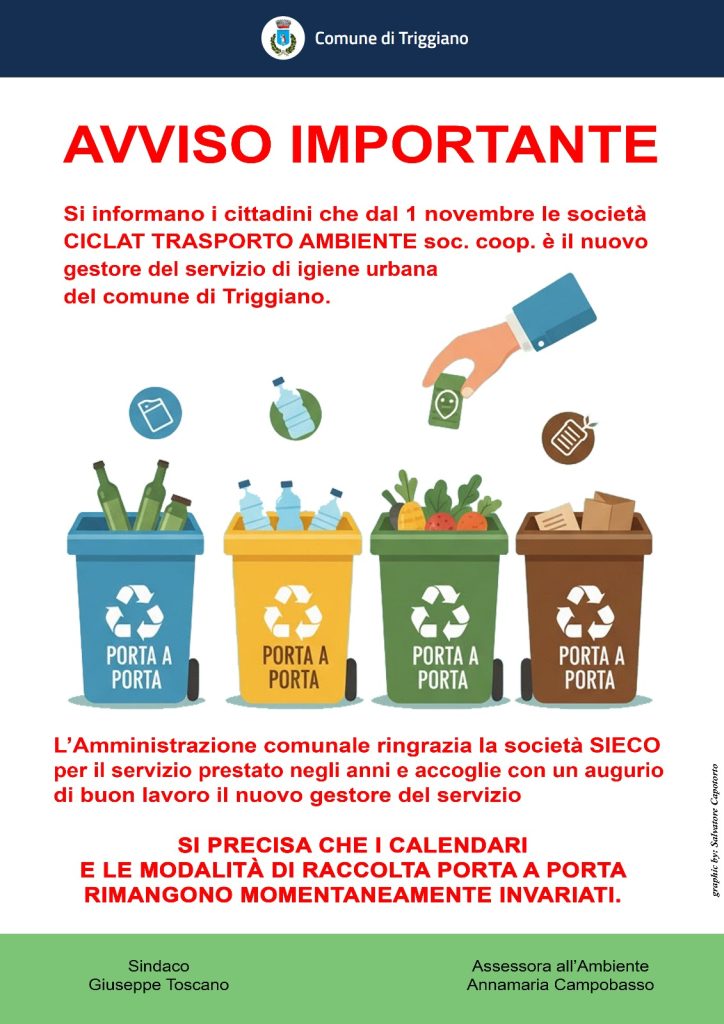 Dal 1° novembre 2025, le società CICLAT TRASPORTI AMBIENTE Soc. Coop. e PICON Srl sono i nuovi gestori del servizio di igiene urbana del Comune di Triggiano.