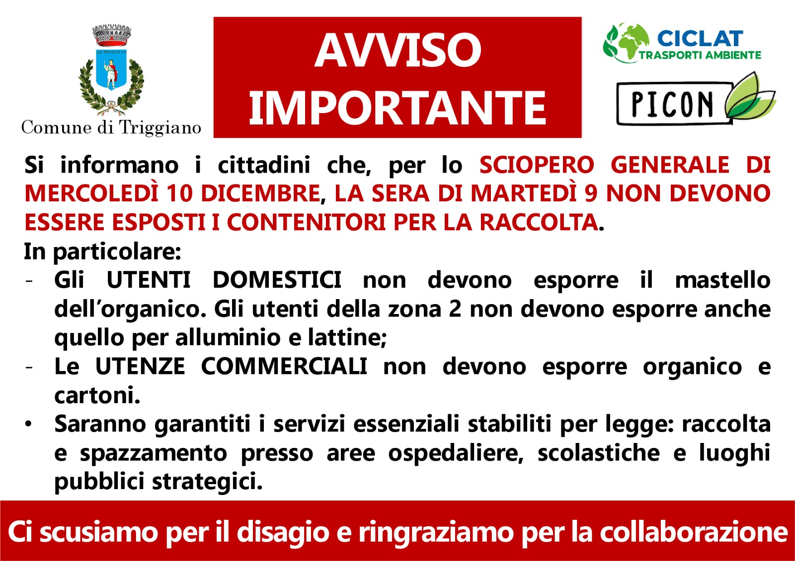 Si informa la cittadinanza che è stato indetto uno sciopero Generale Nazionale, per l’intera giornata del 10/12/2025, da parte delle OO.SS. FP-CGIL, FIT-CISL, UILTRASPORTI e FIADEL.