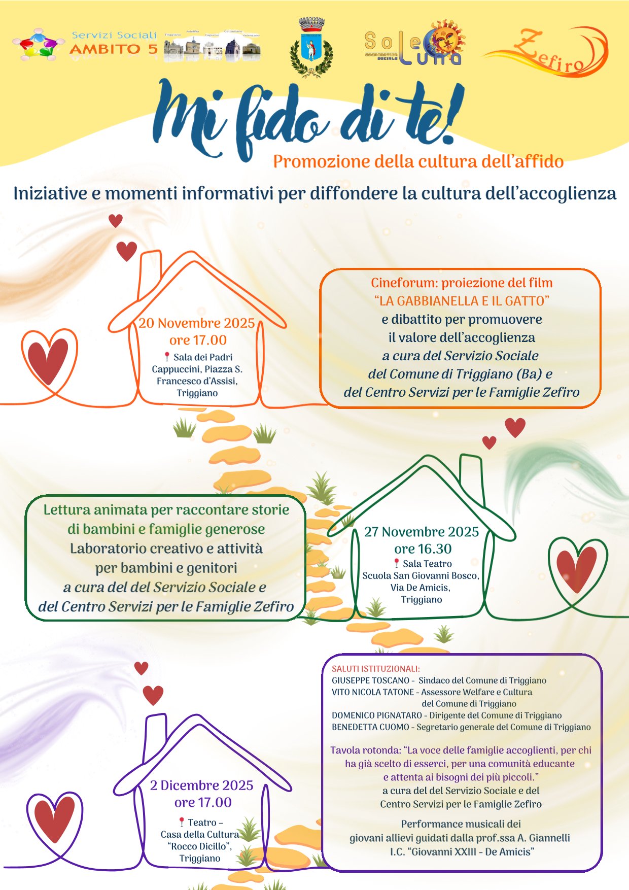 Il Comune di Triggiano si apre al tema della solidarietà familiare per far incontrare gli operatori del Centro Servizi per le Famiglie e dei Servizi Sociali, per informare e diffondere la cultura dell' accoglienza e dell' affido familiare, attraverso cineforum, laboratori, incontri e momenti di scambio per adulti e bambini.